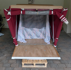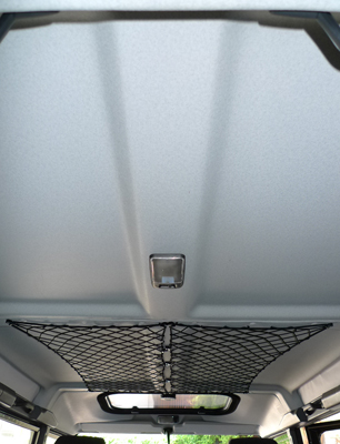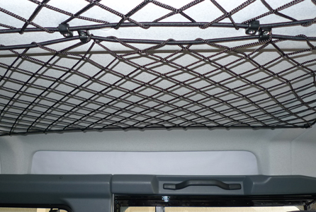 Wir haben uns für kleines Geld ein Netz auf Maß mit fester Umrandung machen lassen. An den Rändern haben wir auf beiden Seiten allerdings Platz gelassen; die Kissen können hier dennoch nicht runter fallen, aber wir können problemlos auf unser Regal, welches als Ablage dient, zugreifen und Mocca kann weiterhin schauen, ob wir auch wirklich noch da sind ;-) Abgespannt wird das Netz oben am hinteren Rahmen des Hubdaches. Zum Hochklettern und Runtersteigen werden einfach die befestigen Schnallen geöffnet. Einfach, schlicht, aber effektiv.